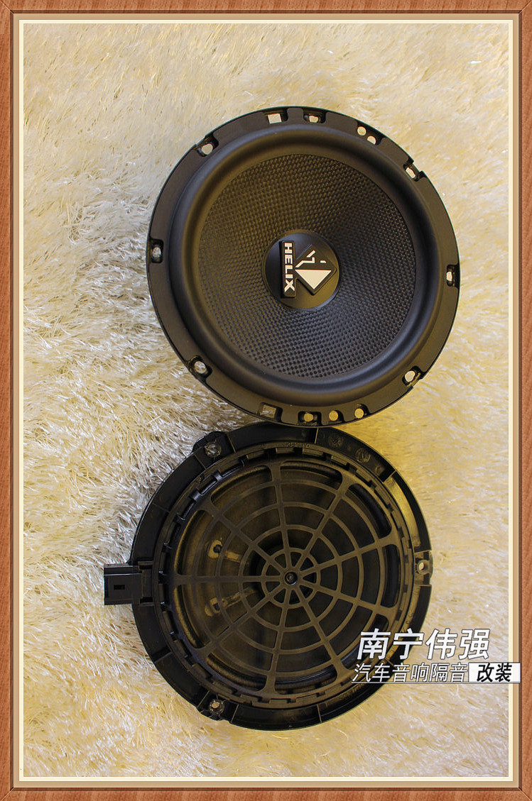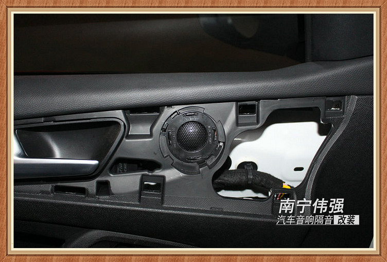 前声场安装喜力士E62C,它的声音很适合听流行和摇滚,正合车主的听音喜好,凭借其干净清脆的音质,深得车主喜欢。前声场喜力士E62C中低音喇叭在安装前先对喇叭圈进行固定好之后在进行中低音原装位的安装,前声场高音单元选择在前车门内饰板原装位进行固定连接安装,分频器则选择在门板合适位置进行固定安装。前声场高音单元喇叭内饰板原装位的安装。