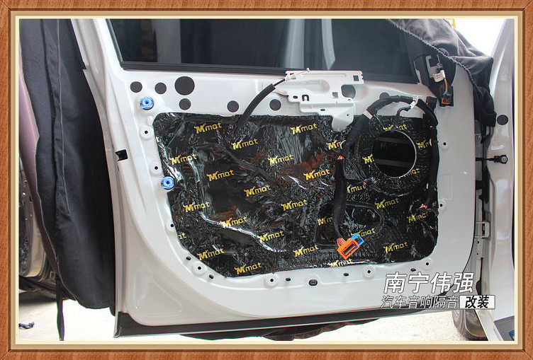 然后在处理干净门板后,开始对门板内层进行条贴隔音处理,从而增加钣金厚度,抑制钣金的振动,降低噪音。
