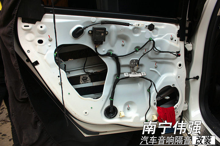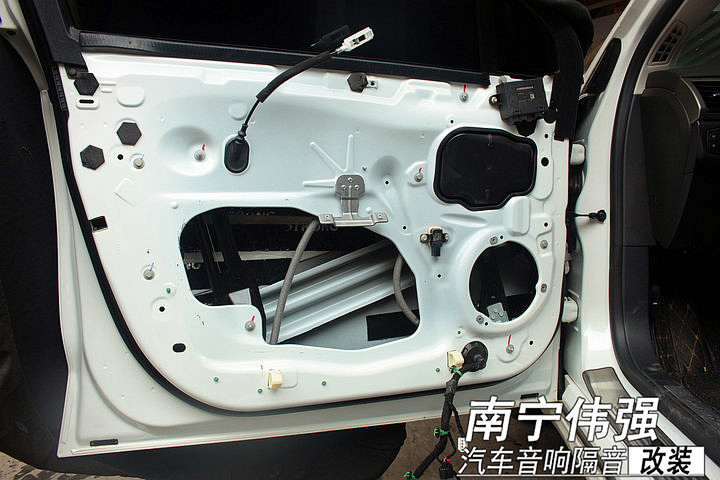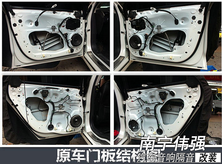 首先全车隔音先从门板开始,拆开门板后会看到原车只有一块薄薄的塑料膜,只能起到防水作用,没有一点隔音效果,而门板因为钣金较薄裸露的地方也很多很容易产生共振和噪音。