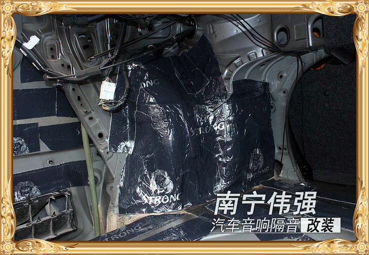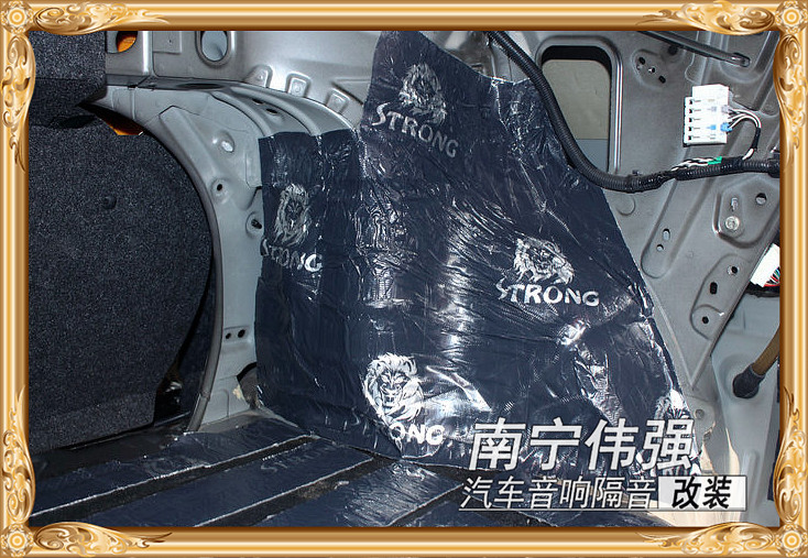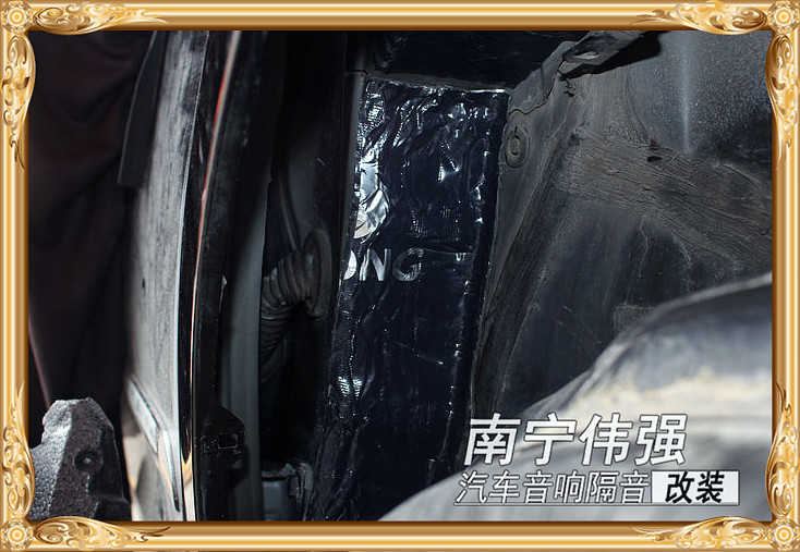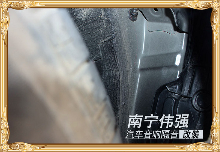 汽车噪声的第三个重灾区是汽车的轮弧和叶子板。汽车在行驶过程当中产生的风噪、胎噪等噪声有很大一部分都是通过轮毂传入到车厢内部的,因此改装技师在车厢内部对汽车的轮毂做了隔音处理,在外部则对叶子板进行隔音,从而切断了此类噪声的主要传播途径。