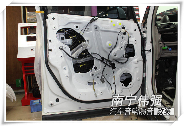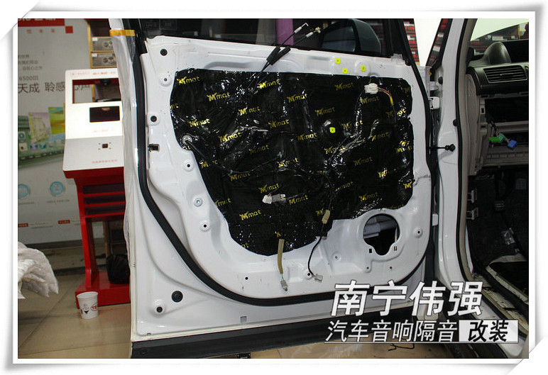 第一层进行门板内层减振隔音材料条贴施工处理主要是为了减少门板的共振噪声
