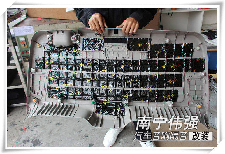 接下来对尾箱盖进行减振隔音处理,而尾箱盖内饰板则进行隔音材料双层隔音处理。