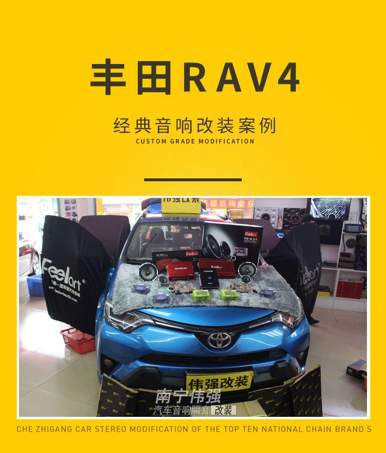 这一辆丰田RAV4,通过进行隔音处理,车内的安静度大幅度提升。前后声场喇叭和功放的升级,让音响系统的演绎能力有了本质上的提升,车主非常满意我们的改装。