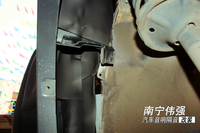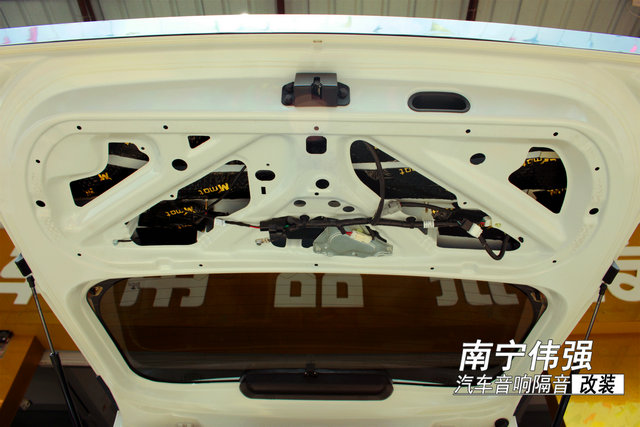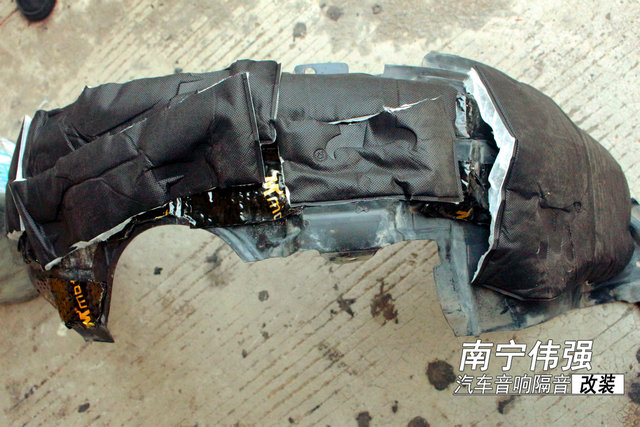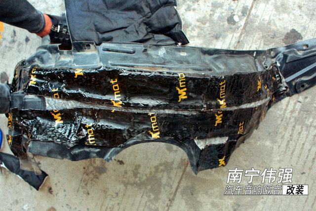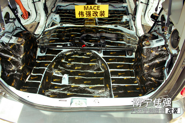后尾箱和底盘一样是进行条贴处理,特别是后轮毂要加强进行满贴隔音处理,这样可以有效降低低频噪音对车厢的传递和抑制钣金的共振。