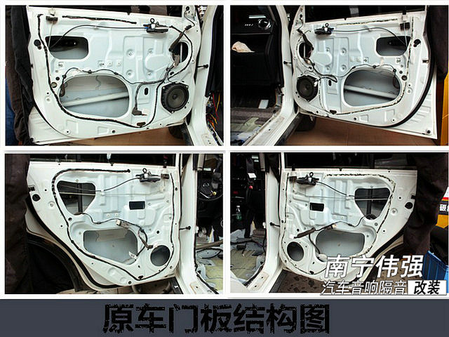 首先全车隔音先从门板开始,拆开门板后会看到原车只有一块薄薄的塑料膜,只能起到防水作用,没有一点隔音效果,而门板因为钣金较薄裸露的地方也很多很容易产生共振和噪音。