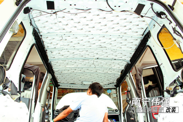 之后对车内的顶棚进行止振板吸音棉双层隔音处理,从而可以有效隔绝下雨天雨水滴落到车顶所产生的噪音。