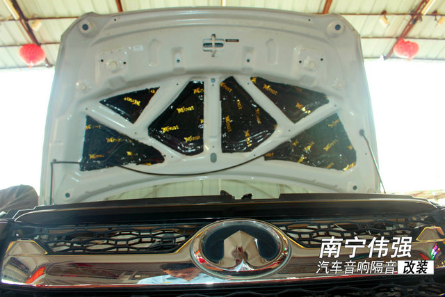 当发动机在高速运转时产生的噪音是很严重,所以我们最后对车辆的引擎盖做了满贴处理,引擎盖的隔音处理不仅可以隔音,更能够很好隔热从而保护车漆。