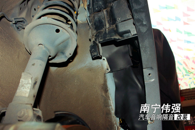 在清理干净底盘之后,对底盘我们进行了两层隔音处理,先用减振板条贴,抑制振动,减少中低频噪音,加强底盘钣金厚度最大限度的减少中低频噪音。