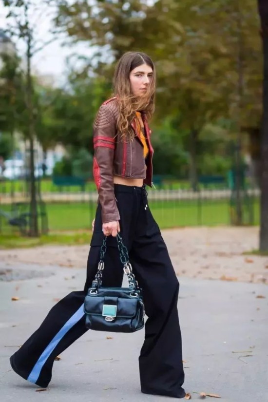 混搭皮外套复古中带点运动感,侧条纹的加持超显活力,加条丝巾很别致。
